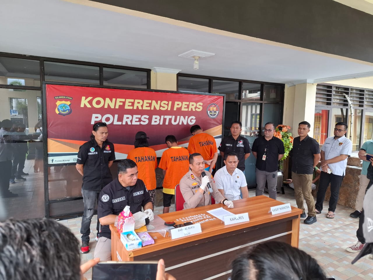 Saat konferensi pers Kapolres Bitung, AKBP Albert Zai, S.I.K.,M.H didampingi Kasat Resnarkoba, Iptu Trivo Datukramat bersama Kasi Humas Iptu Abdul Natip Anggai menjelaskan pengungkapan kasus narkoba jenis shabu.