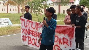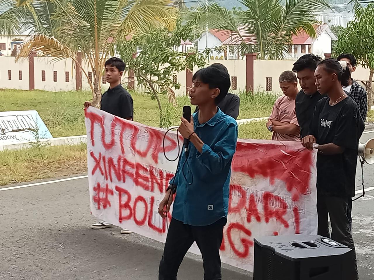 Kordinator Lapangan (Korlap) Hukum dan HAM BEM Nusantara, Almisbah Ali Dodego dan diikuti sekitar pukuhan massa aksi menggelar demo mempersoalkan aktivitas PETI di kawasan perkebunan Oboy yang diduga melibatkan pihak PT XINFENG.